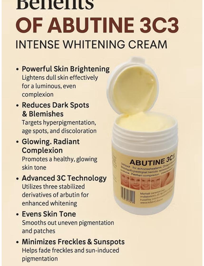 Abutin 3C3 Cream is a skin care product formulated to brighten and even out skin tone. It contains active ingredients that help reduce the appearance of dark spots, hyperpigmentation, and blemishes, promoting a radiant complexion. Designed for daily use, the cream is gentle, moisturizing, and suitable for all skin types.
