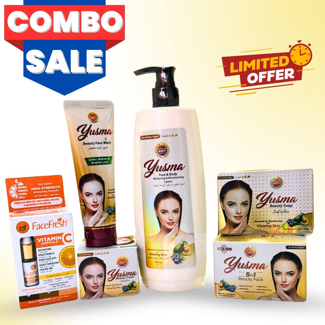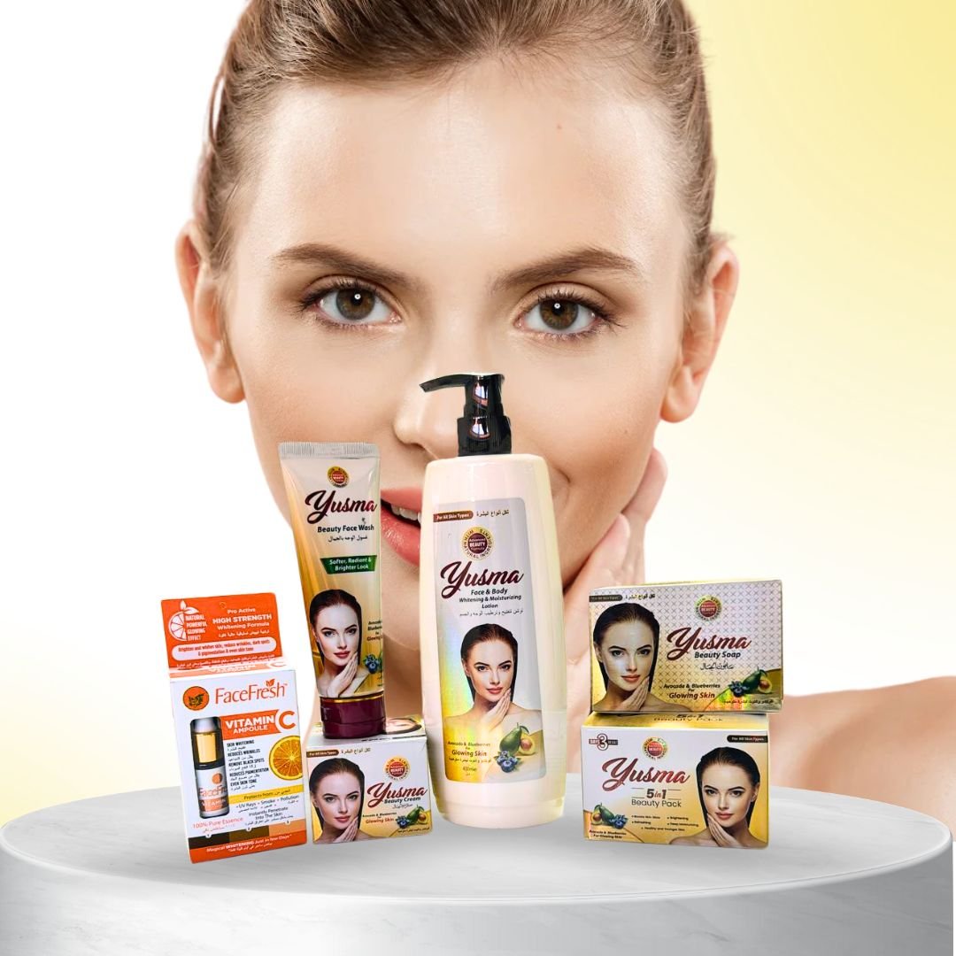 Introducing Yusma 5 in 1 Beauty Pack , Enriched with Avocado and Blueberry extracts, Yusma Full set brightens even skin tone while minimizing wrinkles and targeting dark spot for a healthy and youthful glow.